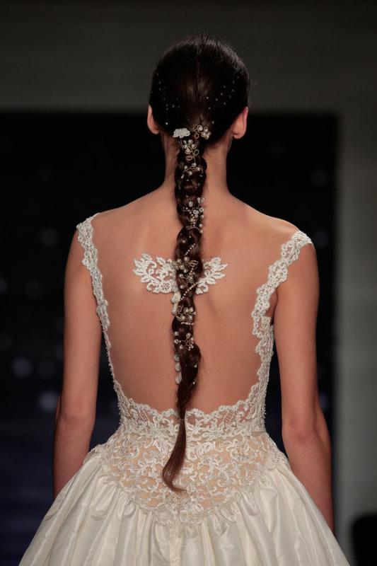 Reem Acra khiến khán giả ngất ngây với phụ kiện là dải ngọc trai cuốn quanh đuôi tóc tết.
