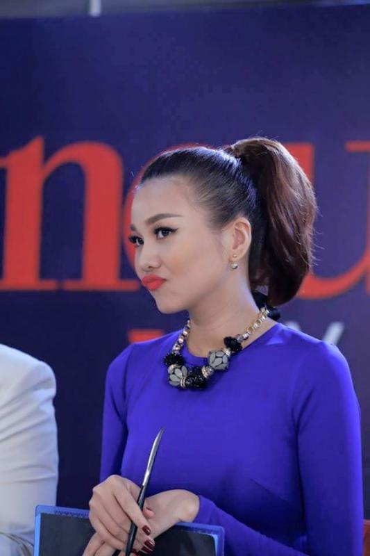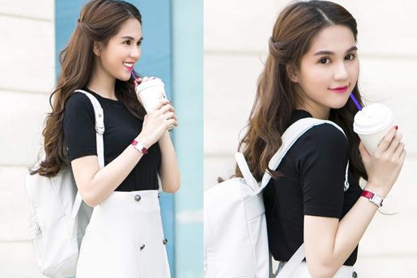 Ngọc Trinh trẻ trung với kiểu tóc buộc nửa chỉ lấy 2 lọn tóc 2 bên rồi buộc túm lại ở đằng sau.