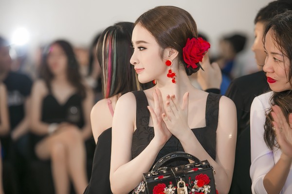 Angela Phương Trinh lại điểm tô cho mái tóc búi thấp của mình bằng phụ kiện cài hoa.