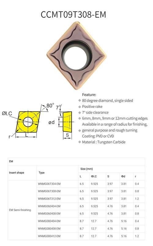 Trong ngành gia công kim loại, dụng cụ cắt gọt Chip tiện CCMT09T308-EM được sử dụng để loại bỏ vật liệu khỏi phôi bằng phương pháp bóc tách kim loại là cực kỳ quan trọng