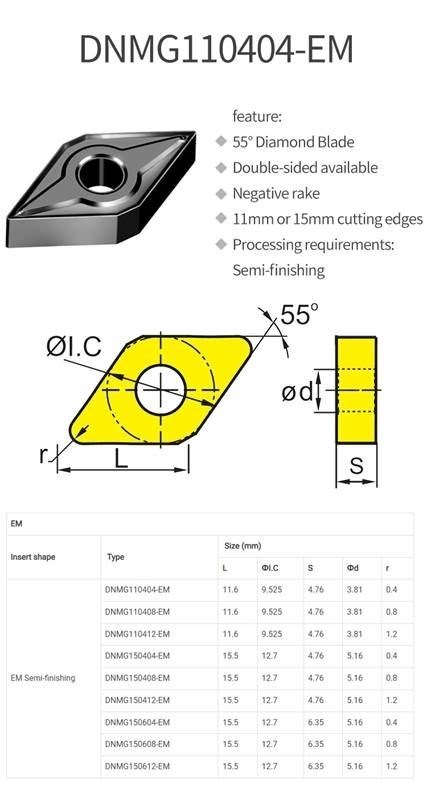 Dụng cụ cắt gọt kim loại Chip tiện DNMG110404-EM sử dụng trong ngành gia công cơ khí, là dụng cụ có độ cứng cao hơn chi tiết gia công, được lắp đặt vào máy công cụ (máy tiện, máy phay, máy bào, máy khoan,..) nhằm phục vụ cho ngành gia công cơ khí, nhằm mục đích chế tạo ra các chi tiết cơ khí, phục vụ cho việc lắp ráp, chế tạo hoặc sửa chữa máy móc, thiết bị.