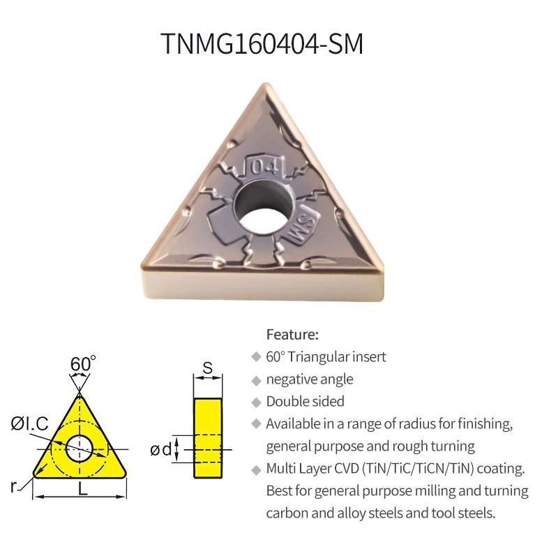 Dụng cụ cắt gọt kim loại Chip tiện TNMG160408-SM sử dụng trong ngành gia công cơ khí, là dụng cụ có độ cứng cao hơn chi tiết gia công, được lắp đặt vào máy công cụ (máy tiện, máy phay, máy bào, máy khoan,..) nhằm phục vụ cho ngành gia công cơ khí, nhằm mục đích chế tạo ra các chi tiết cơ khí, phục vụ cho việc lắp ráp, chế tạo hoặc sửa chữa máy móc, thiết bị.