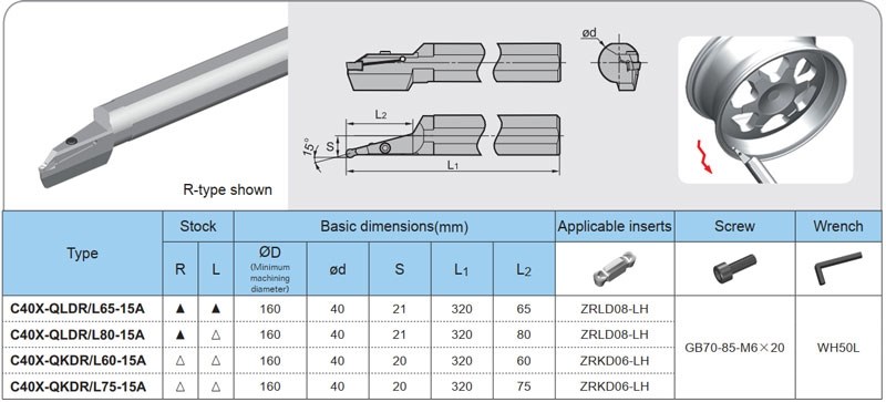 – C40X-QKDR/L60-15A; C40X-QKDR/L75-15A: Kích thước cán dao d40mm; chiều dài dao tiện 320mm; sử dụng chíp tiện rãnh tròn 8.0mm: ZRKD06-LH.