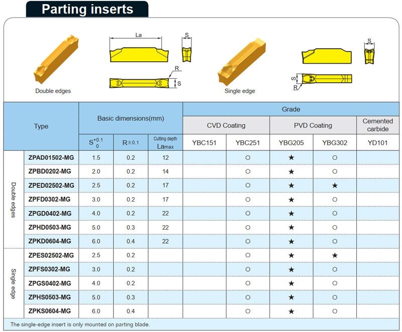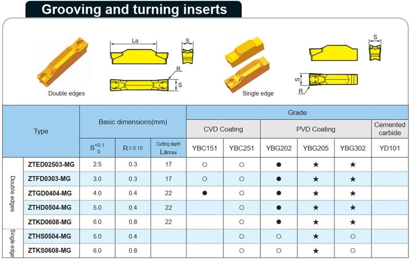 Với cán dao tiện cắt đứt và tiện rãnh, chúng ta có thể mua các loại chíp tiện ZPBD…; ZTBD…. khác nhau theo bảng sau cho từng kích thước rãnh gia công, độ chính xác, vật liệu gia công thì ta chọn chíp tiện theo bảng sau: