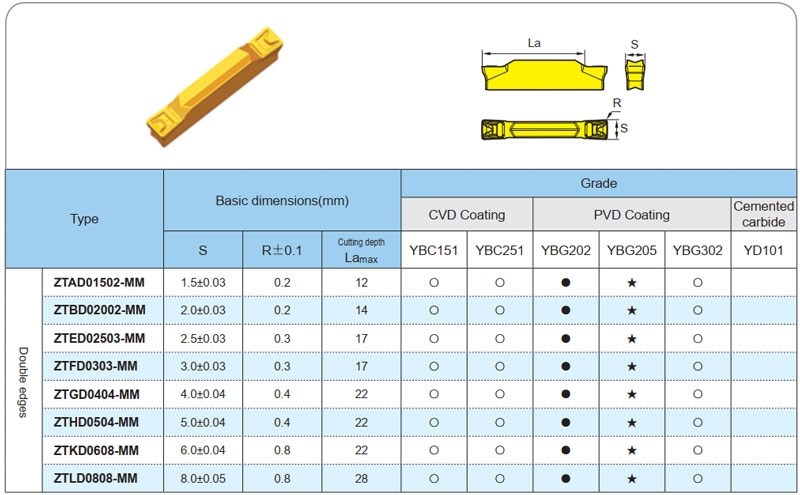 – QELD 2525R/L16 ~ QELD 3232R/L28: Kích thước chuôi cán dao tiện cắt đứt từ 25×25 ~ 32×32; chiều dài dao tiện cắt đứt 140, 170mm; chiều rộng rãnh tiện được là W = 8.0mm; chiều sâu lớn nhất tiện được là armax từ 16 ~ 28mm; sử dụng chíp tiện cắt đứt ZTLD0808-MM.