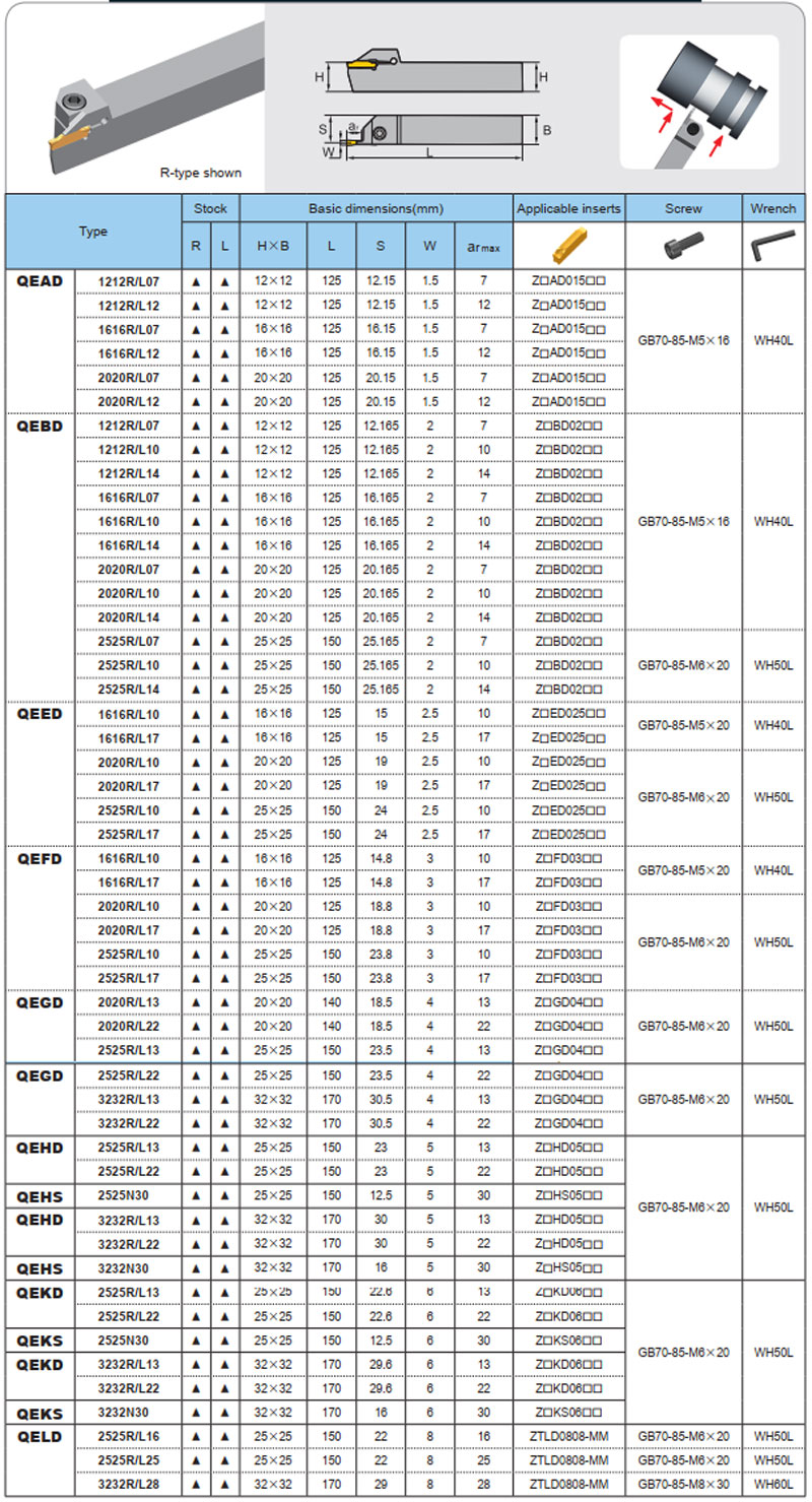 Để chọn model sản phẩm, bạn chọn theo cột đầu tiên “Type”: Kết hợp 4 kí tự đầu (QEAD; QEBD; QEED; QEFD; QEGD;…) với các kí tự phía sau thể hiện kích thước cán dao tiện: