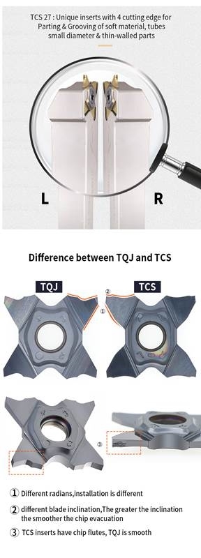 Dụng cụ cắt gọt kim loại Mảnh tiện rãnh TCS27 sử dụng trong ngành gia công cơ khí, là dụng cụ có độ cứng cao hơn chi tiết gia công, được lắp đặt vào máy công cụ (máy tiện, máy phay, máy bào, máy khoan,..) nhằm phục vụ cho ngành gia công cơ khí, nhằm mục đích chế tạo ra các chi tiết cơ khí, phục vụ cho việc lắp ráp, chế tạo hoặc sửa chữa máy móc, thiết bị.