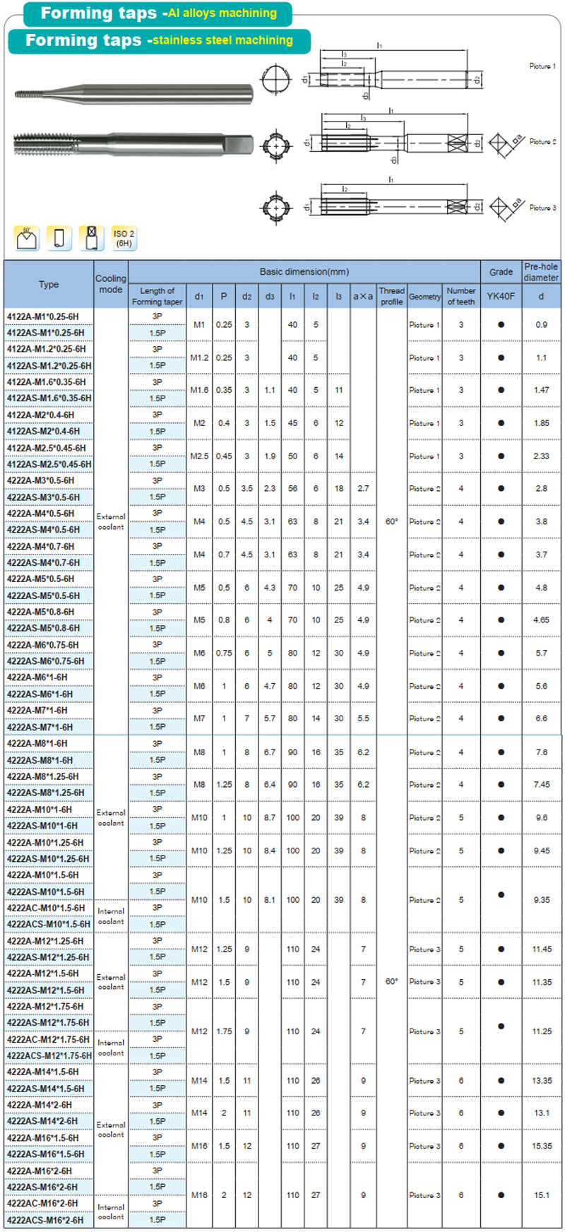 – Lưu ý: Mũi taro nén Forming tap chỉ gia công các vật liệu mềm như: nhôm; inox; thép mềm (thành phần Cacbon 0.05% – 0.29%).
