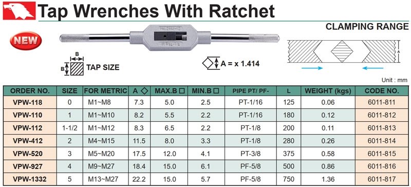 – Mỗi 1 model kẹp được 1 khoảng mũi ta rô nhất định. – Tay quay ta rô VERTEX: VPW-118, VPW-110, VPW-112, VPW-412, VPW-520, VPW-927, VPW-1332 được sử dụng kẹp mũi ta rô tay từ M1 đến M27.